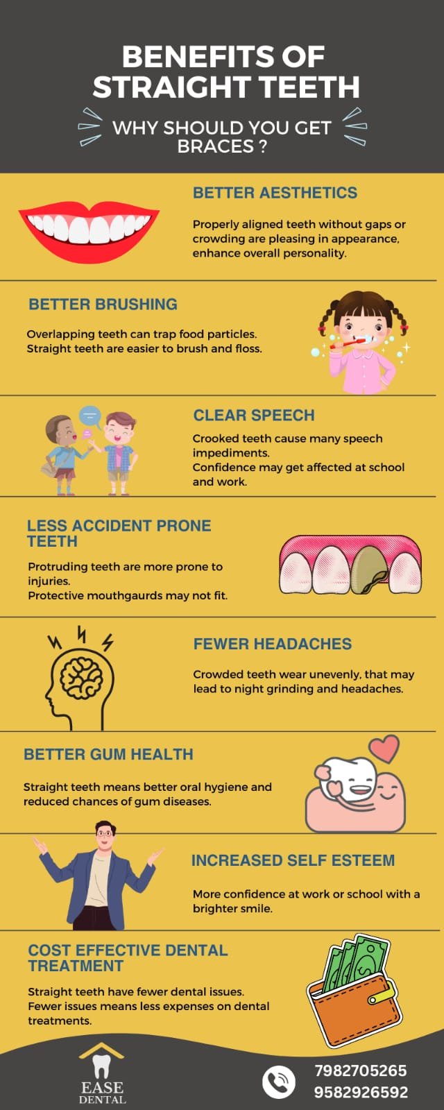 Braces and orthodontics offer numerous benefits, including improved oral health, enhanced aesthetic appearance, and better bite functionality. At Ease Dental, we provide customized treatment plans, expert care, and state-of-the-art technology to help our patients achieve their desired smiles with confidence and ease. If you're considering orthodontic treatment to straighten your teeth and enhance your smile, schedule a consultation with our experienced orthodontic team today. Unlock your perfect smile with Ease Dental!